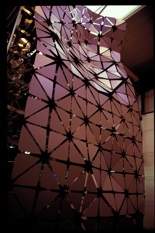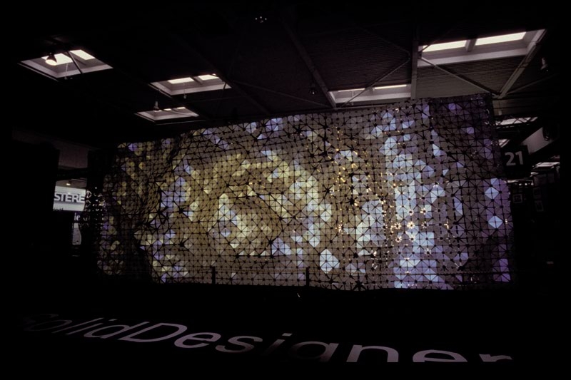 The Aegis Hyposurface is a dECOi project, the inspiration of and led by Mark Goulthorpe and the dECOi office along with a large multi-disciplinary team of architects, engineers, mathematicians and computer programmers, among others. I collaborated with Mark in the competition entry and the development of the project to the point where a working prototype 10 metres wide and 3 metres high was a star attraction at the March 2001 Cebit trade fair. I was working at Deakin University at the time, and we drew heavily on the expertise of other departments at teh University, principally Professor Saeid Navahandi and Dr Abbas Kouzani – creative mechatronics geniuses. Please see below for a full list of the members of the project team.