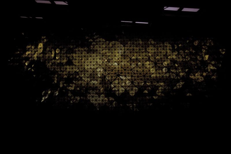 This project was developed for a competition for an interactive art-work outside the foyer of The Birmingham Hippodrome Theatre situated on a protruding section of wall 5m above the pavement below: a projecting billboard. ‘Aegis’ is a faceted metallic surface that has potential to deform physically as a real time response to electronic stimuli from the environment (movement, sound, light,etc). Driven by a bed of 896 pneumatic pistons, the dynamic ‘terrains’ are generated as real-time calculations.